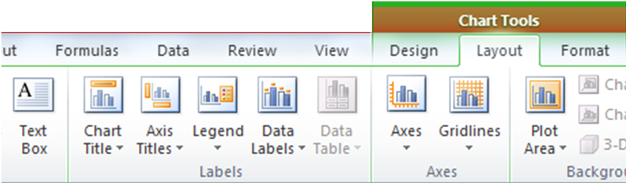 Start by clicking on your graph and going to Layout in the Chart Tools Tab. Note: you must click on your graph in order to see the Chart Tools Tab. You should see these options at the top of your spreadsheet: