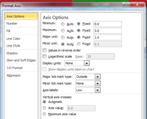 Axes: The Axes option is really important for formatting your graph! For each axis (the Horizontal, or “x” axis, and the Vertical, or “y” axis), select “More Primary Horizontal (or Vertical) Axis Options” to get the most flexibility in adjusting your graph. It’s often helpful to select “Fixed” as shown in the screen shot below. This feature allows you to adjust the minimum and maximum values displayed along each axis, and to set the interval for tick marks (referred to in Excel as the Major unit). Also, in some cases you will want to turn the Axis labels off - if so, change the Axis labels setting to None.