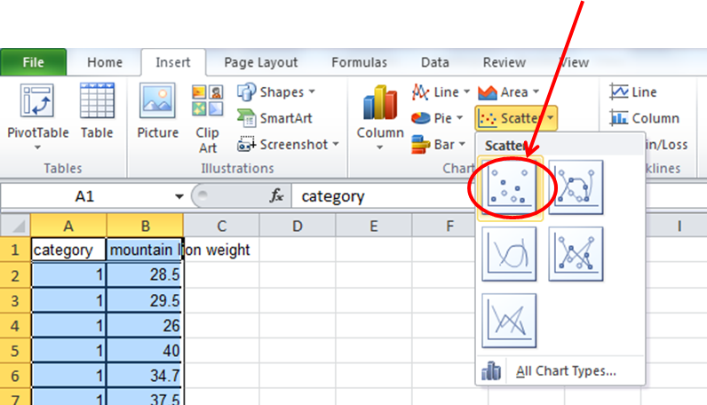 Once your data are entered like those shown in the table above, click and highlight your column headings and all of your data, then click the Insert tab, choose the Chart type Scatter, and click on the Chart with data points but no lines.