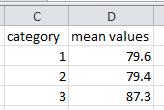 To add mean values to a scatterplot, you need to setup two new columns in your data sheet, the first with the numbers representing your categories (in this case, 1, 2, and 3); the second with the corresponding mean values. You can calculate mean values using a calculator, formulas in Excel, or get them from statistical output from a t-Test or ANOVA.