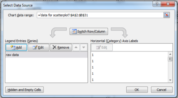 To add the mean values to your graph, right click within the graph and click Select Data. You should see a window that looks like this: